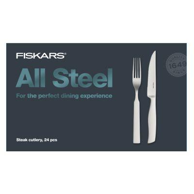 Fiskars All Steel noževi za odreske izrađeni su od visokokvalitetnog nehrđajućeg čelika u tvornici Sorsakoski u Finskoj. 24-dijelni set vilica i noževa u modernom dizajnu namijenjen je za 12 osoba.