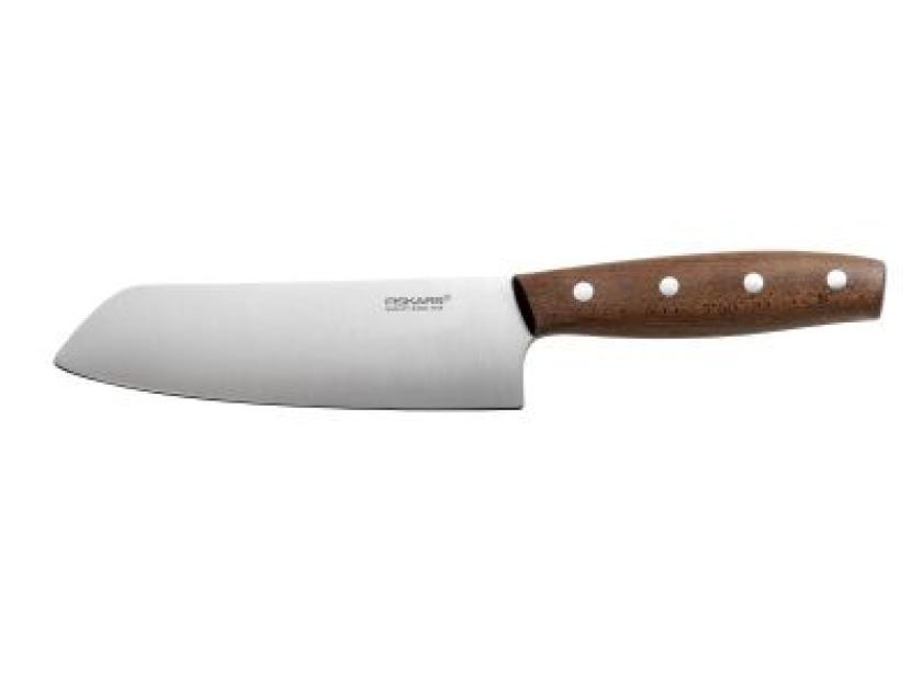 Vrhunski nož iz serije Norr japanskog tipa Santoku sa širokom oštricom, pogodan je za pripremu ribe, mesa i povrća. Savršen i kvalitetan nož sa drvenom drškom, lijepog dizajna.