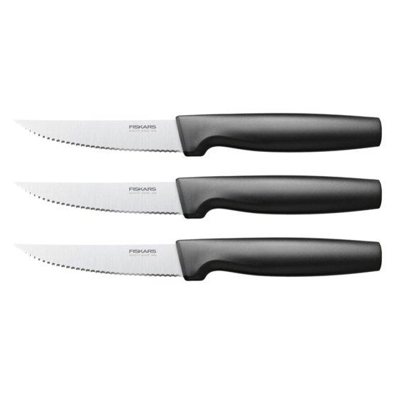 Fiskars Functional Form ™ Set od tri noža za odreske uključuje noževe za odreske s nazubljenim oštricama koji dobro režu i dobro se održavaju Izdržljiva japanska oštrica od nehrđajućeg čelika pruža visoku učinkovitost rezanja (testirano prema CATRA metodologiji)